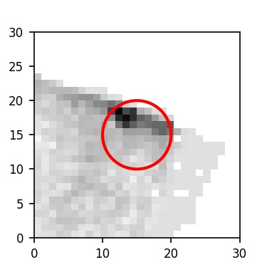 The red circle in the various panels is 1" in radius. The images are 6"x6".