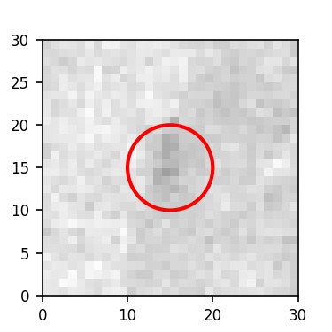 The red circle in the various panels is 1" in radius. The images are 6"x6".