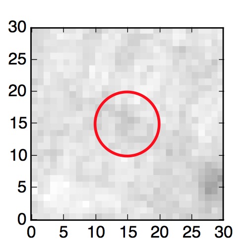 The red circle in the various panels is 1" in radius. The images are 6"x6".
