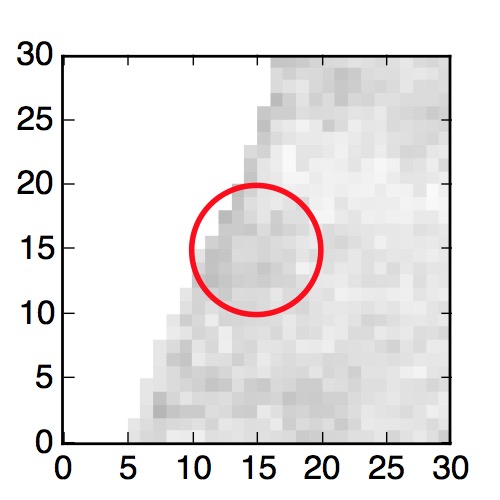 The red circle in the various panels is 1" in radius. The images are 6"x6".
