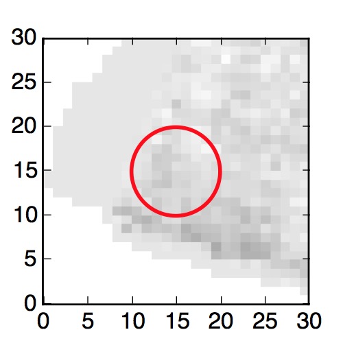The red circle in the various panels is 1" in radius. The images are 6"x6".