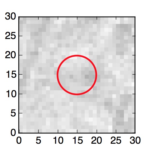 The red circle in the various panels is 1" in radius. The images are 6"x6".