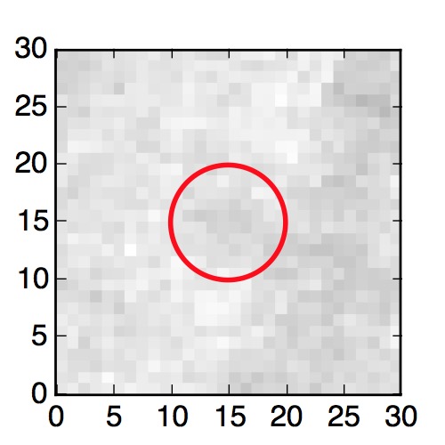 The red circle in the various panels is 1" in radius. The images are 6"x6".