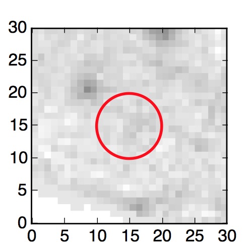 The red circle in the various panels is 1" in radius. The images are 6"x6".