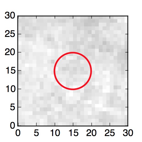The red circle in the various panels is 1" in radius. The images are 6"x6".