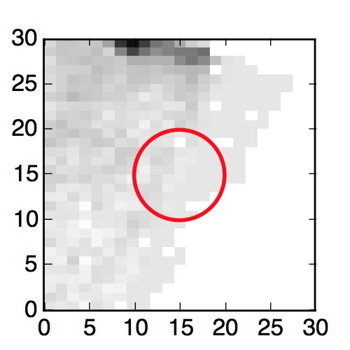 The red circle in the various panels is 1" in radius. The images are 6"x6".
