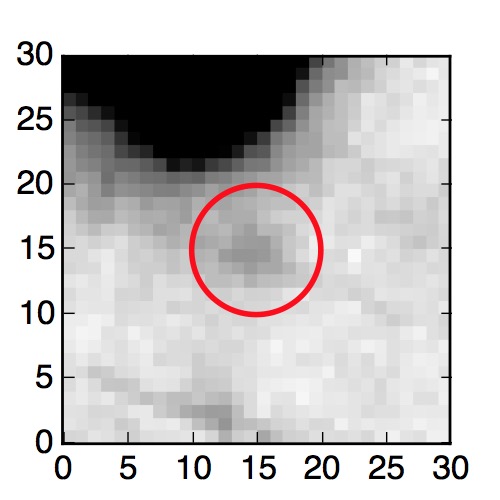 The red circle in the various panels is 1" in radius. The images are 6"x6".