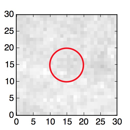 The red circle in the various panels is 1" in radius. The images are 6"x6".