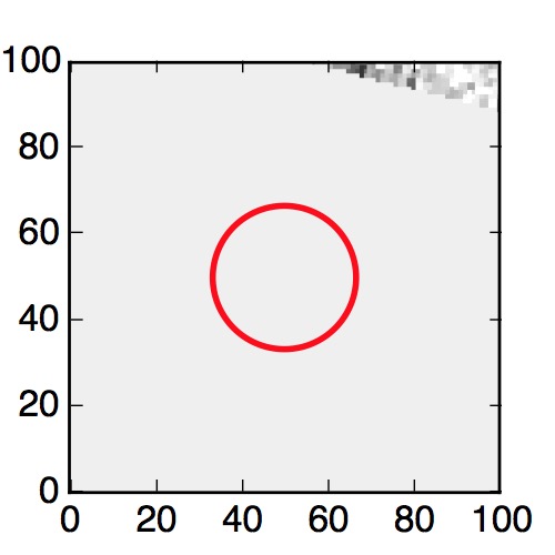 The red circle in the various panels is 1" in radius. The images are 6"x6".