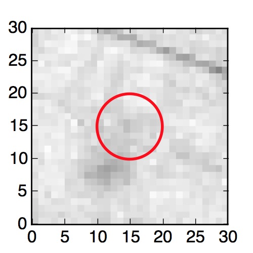 The red circle in the various panels is 1" in radius. The images are 6"x6".